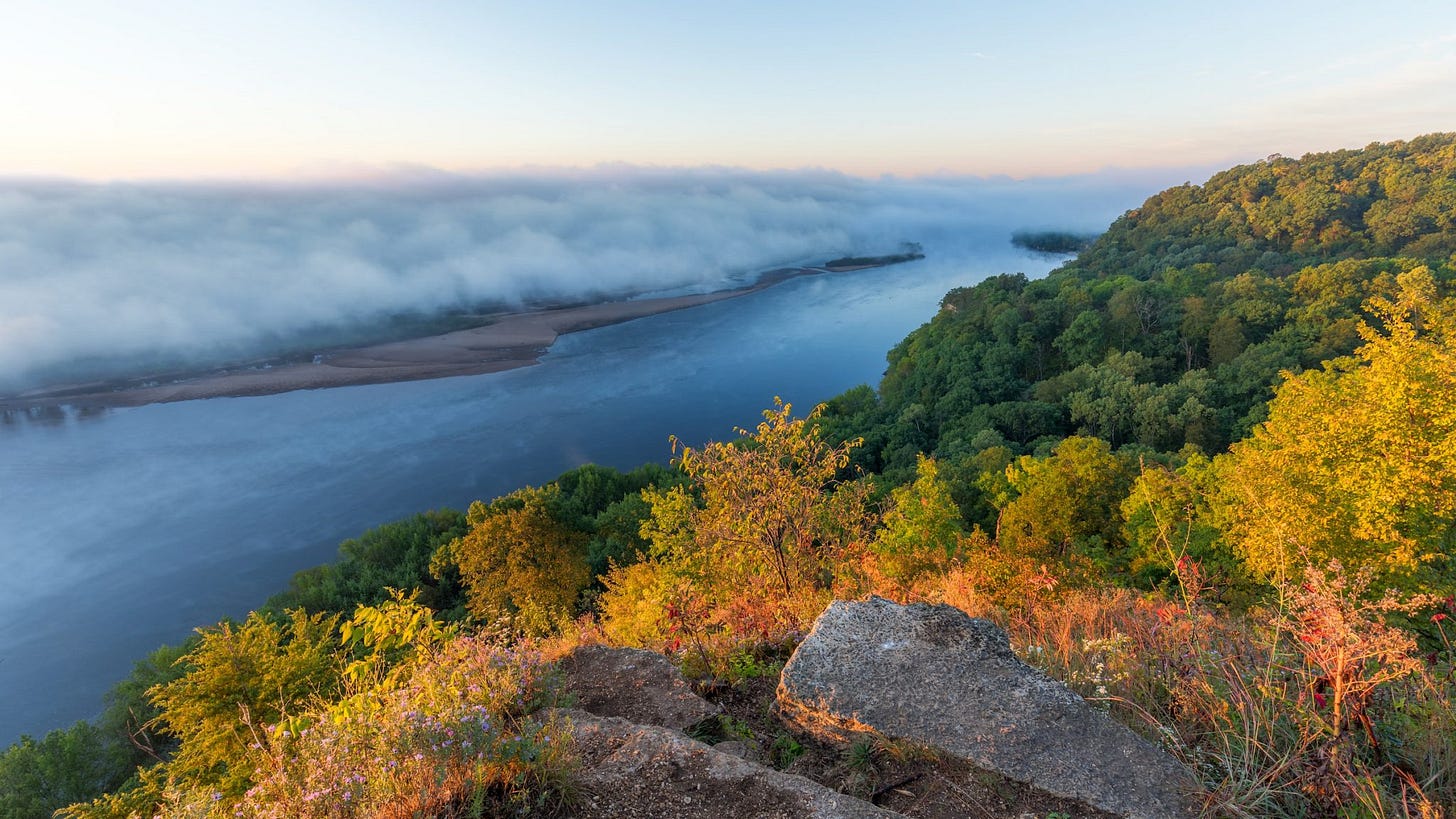 And though they can’t compete with the Great Smokies, the Bluffs have their charm. What, you say, are the Bluffs? Forested hills reminiscent of mountain foothills. Formed by the movement of glaciers millennia ago, they run in a line from Minnesota, through Wisconsin to Iowa. Not a straight line, mind you, accounting for many a curvy, hilly road. The bluffs frame valleys, home to towns, cities and farmland complete with grazing cattle, soaring silos and red barns, all set in a sea of almost iridescent green.